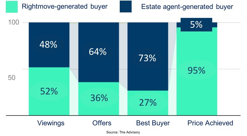 The research suggests that while Rightmove, for example, may directly generate 52% of viewings, this results in only 36% of offers and 27% of the best buyers, whereas High Street estate agents generate 48% more viewings, 64% more offers and, in 73% of cases, a 5% higher sale price.