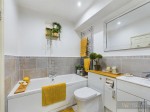 A luxuriously appointed facility provides a modern white suite comprising bath tub, separate walk-in shower enclosure, vanity wash basin with fitted cabinetry and counter top, and a WC with concealed cistern. With attractive tiling, chrome towel radiator, shaver point and extractor fan.