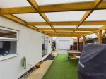 The property sits side-on to the road, behind a hedged boundary with a gated vehicular entrance onto an expansive gravelled forecourt which provides generous parking space for multiple vehicles. This space is perfect for those with a Caravan, Motorhome, Trailer etc. A further gated access at the side of the bungalow leads through a carport space towards the detached single Garage.