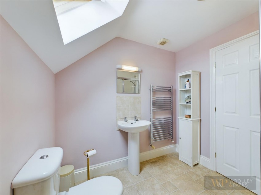 Sizable main bathroom comprising a walk in shower with wet wall panels and mains powered shower over, pedestal wash basin with tile splashback and low flush w/c, wall mounted chrome heated towel rail, double glazed Velux window and tile effect flooring.